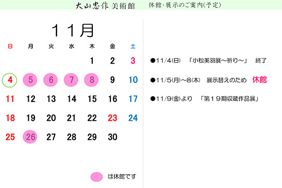 展示替え作業のため、11月18日(月)~27日(水)は臨時休館いたします。